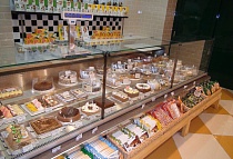 При магазине работает кафетерий (2 наценочная категория), где к чаю и кофе предлагаются свежие пирожные (хлебозаводов №2, №3, №5, №6), булочки (хлебозаводов №1, №2, №3, №5), пирожки с грибами (хлебозавода №2) и другое.