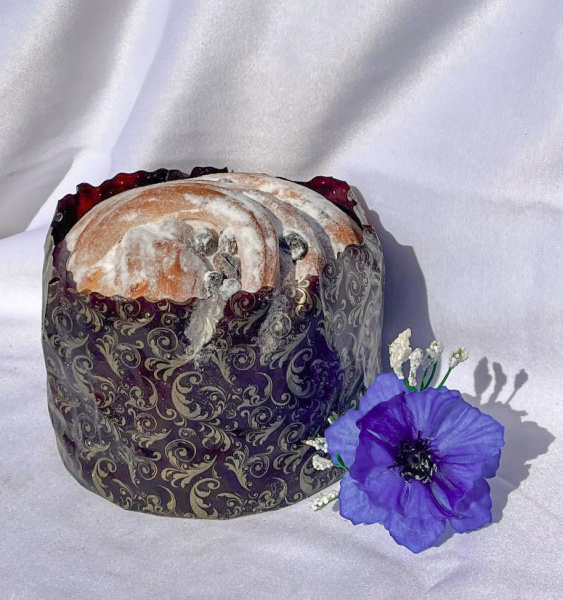 Описание продуктаДрожжевой кекс, вырабатываемый из муки пшеничной высшего сорта, сушеного винограда, концентрата для пирогов, булочных и мучных кондитерских изделий, маргарина, сахара, яиц куриных пищевых и другого сырья. Поверхность отделана сахарной пудрой.