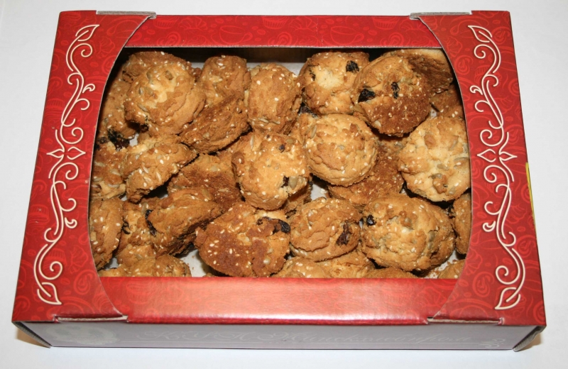 Описание продуктамука пшеничная высшего сорта, маргарин (масла растительные рафинированные дезодорированные, масла растительные модифицированные рафинированные дезодорированные, вода, соль поваренная пищевая йодированная, сыворотка сухая, сахар, эмульгатор- моно-и диглицериды жирных кислот, консервант – бензоат натрия, краситель - ?- каротин, ароматизатор «Масло сливочное»), ядро семян подсолнечника, виноград сушеный, сахарная пудра, семена кунжута, яйца куриные пищевые, молоко сухое обезжиренное, соль поваренная пищевая йодированная (антислеживающая добавка Е536), разрыхлители: соли углеаммонийные, натрий двууглекислый, вода питьевая.
