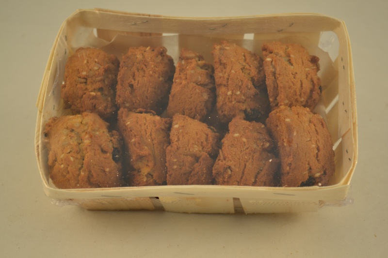 Описание продуктамука пшеничная высшего сорта, маргарин «Молочный», ядро семян подсолнечника, виноград сушеный, сахарная пудра, семена кунжута, яйца куриные пищевые, молоко сухое обезжиренное, соль поваренная пищевая йодированная, разрыхлители: гидрокарбонат аммония, гидрокарбонат натрия.
