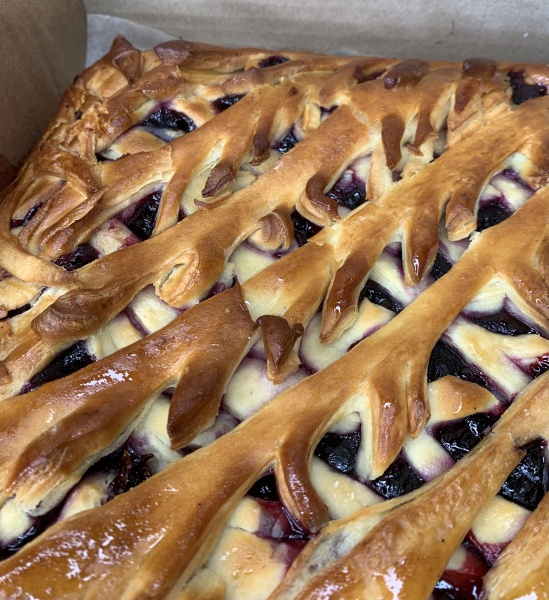 Описание продуктаВыпеченное изделие из дрожжевого слоеного теста с черничной начинкой из быстрозамороженной черники, сахара и другого сырья. Состав: черника быстрозамороженная, мука пшеничная высшего сорта, сахар, вода питьевая, маргарин растительный для слоения, маргарин «Молочный», комплексная пищевая добавка «Магия Джель», яйца куриные пищевые, дрожжи прессованные, соль поваренная пищевая йодированная, спирт этиловый ректификованный.