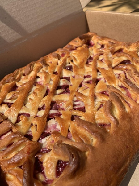 Описание продуктаВыпеченное изделие из дрожжевого слоеного теста с вишневой начинкой из быстрозамороженной вишни, сахара и другого сырья. Состав: вишня быстрозамороженная, мука пшеничная высшего сорта, сахар, вода питьевая, маргарин растительный для слоения, маргарин «Молочный», комплексная пищевая добавка «Магия Джель» (модифицированный крахмал), яйца куриные пищевые, дрожжи прессованные, соль поваренная пищевая йодированная, спирт этиловый ректификованный.