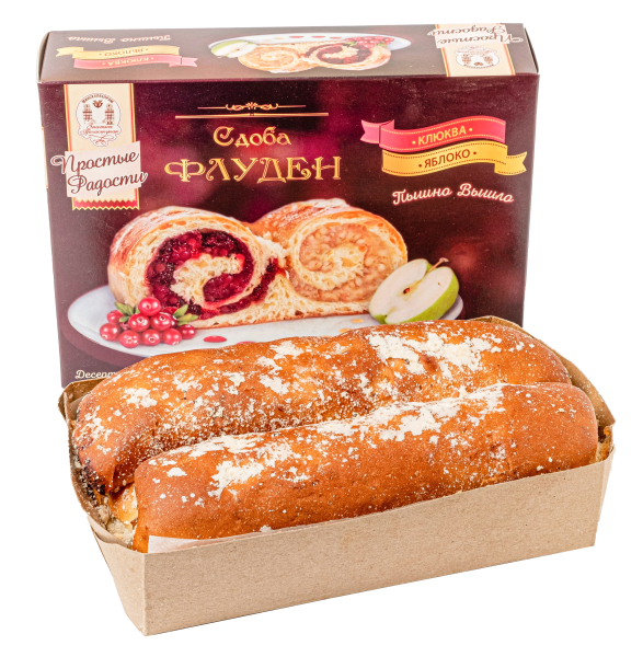 Описание продуктаМука пшеничная высшего сорта, вода питьевая, полуфабрикат: начинка фруктовая «Клюква», полуфабрикат: начинка фруктовая «Яблоко», сахар, концентрат для пирогов, булочных и мучных кондитерских изделий, маргарин «Молочный», яйца куриные пищевые, дрожжи хлебопекарные прессованные, молоко сухое обезжиренное, соль йодированная, пищевая добавка.