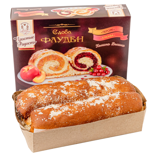 Описание продуктаМука пшеничная высшего сорта, вода питьевая, полуфабрикат: начинка фруктовая «Клюква», полуфабрикат: начинка фруктовая «Персик, сахар, концентрат для пирогов, булочных и мучных кондитерских, маргарин «Молочный», яйца куриные пищевые, дрожжи хлебопекарные прессованные, молоко сухое обезжиренное, соль йодированная, пищевая добавка.