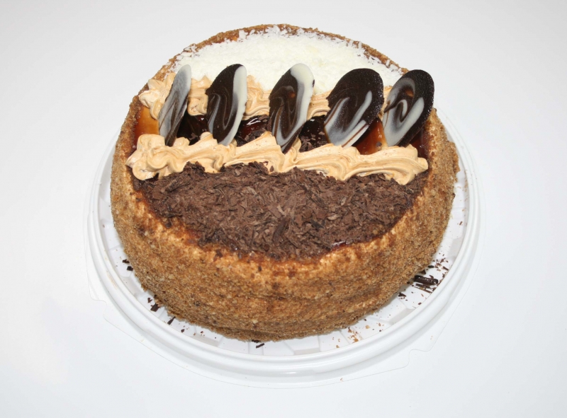 Описание продуктакрем на растительных маслах «Арибель» [вода питьевая; жир растительный (рафинированное, дезодорированное пальмоядровое масло, эмульгатор Е322); сахар-песок; комплексная пищевая добавка Стабимульс ICR34 (эмульгаторы ( Е464,Е471,Е475,Е481), регуляторы кислотности Е331, Е339, агент антислеживающий Е460, загуститель Е466, желатин, антиокислитель Е385, загуститель Е412, антиокислитель Е304, глюкоза); декстроза моногидрат; агент влагоудерживающий Е1520; эмульгатор стабисол SMS20-Е435; соль поваренная пищевая йодированная, ароматизатор пищевой идентичный натуральному «Пломбир», консерванты: сорбат калия, бензоат натрия]; молоко сгущенное с сахаром вареное «Лакомка» [нормализованное молоко, сахар ( сахароза, лактоза), антикристаллизатор - ферментный препарат микробного происхождения лактаза, комплексная пищевая добавка «Стабилизационная система «Эко К» (загуститель Е 1422, стабилизаторы Е 415, Е 410), регулятор кислотности – пищевая сода»]; яйца куриные пищевые; мука пшеничная высшего сорта; сахар; полуфабрикат отделочный: масса желейная со вкусом карамели [сахар, сироп глюкозо-фруктовый, вода, стабилизатор (Е202, Е211), ароматизатор идентичный натуральному «Карамель-сливки», красители : Е150, Е155, Е102, Е133], кондитерская паста т.м. Мастер Мартини “Каравелла крем какао” (негидрогенизированные растительные масла и жиры (масла (соевые, рапсовые, подсолнечные и кукурузные), жиры ( пальмовые) обезжиренный какао порошок, сахар, лесной орех, эмульгатор Е322 – соевый лецитин), ароматизатор); глазурь молочная [сахар, заменитель какао-масла (масла растительные в натуральном и модифицированном виде лауринового типа рафинированные дезодорированные (пальмоядровое), эмульгаторы сорбитан тристеарат, соевый лецитин), сыворотка молочная сухая, эмульгаторы – лецитин соевый, Е476,пищевой ароматизатор «Ванилин»];глазурь кондитерская какаосодержащая [сахар, заменитель какао-масла ( масла растительные лауринового типа рафинированные дезодорированные, эмульгаторы сорбитан тристеарат, лецитин), какао-порошок , эмульгаторы - лецитин соевый, Е476, ароматизаторы.]; комплексная пищевая добавка “Монопалс-100” [вода, сахар, эмульгатор Е471, влагоудерживающий агентЕ1520, эмульгаторы Е475, Е430]; ; коньяк [коньячные спирты, вода умягчённая, сахарный сироп, пищевая добавка: краситель натуральный – сахарный колер ], разрыхлитель - натрий двууглекислый; регулятор кислотности - кислота лимонная; вино десертное [пищевые добавки: антиокислитель Е220, консервант Е 202; ; ароматизатор «Кофе» [ носитель пропиленгликоль Е1520, вкусоароматический компонент], ароматизатор Ром [ носитель пропиленгликоль Е1520, вкусоароматический компонент], вода питьевая.