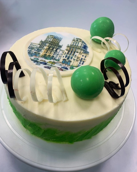 Описание продуктаCостоит из слоев воздушно-орехового полуфабриката с грецким орехом, соединенных начинкой "Сливочно-молочная" №2 и клубникой уваренной. Верхняя и боковые поверхности покрыты кремом "Чиз" новый. Верхняя поверхность украшена глазурью кондитерской белой, глазурью кондитерской какаосодержащей, мастикой сахарной с нанесенной на ней рисунком пищевыми красителями с помощью пищевого плоттера.