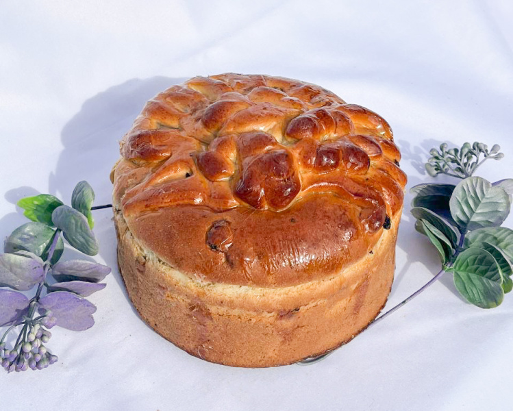 Описание продуктаСладкий дрожжевой кекс из муки высшего сорта, с добавлением сушеного винограда и легким ароматом ванили. Верхняя поверхность украшена фигурками из того же теста.